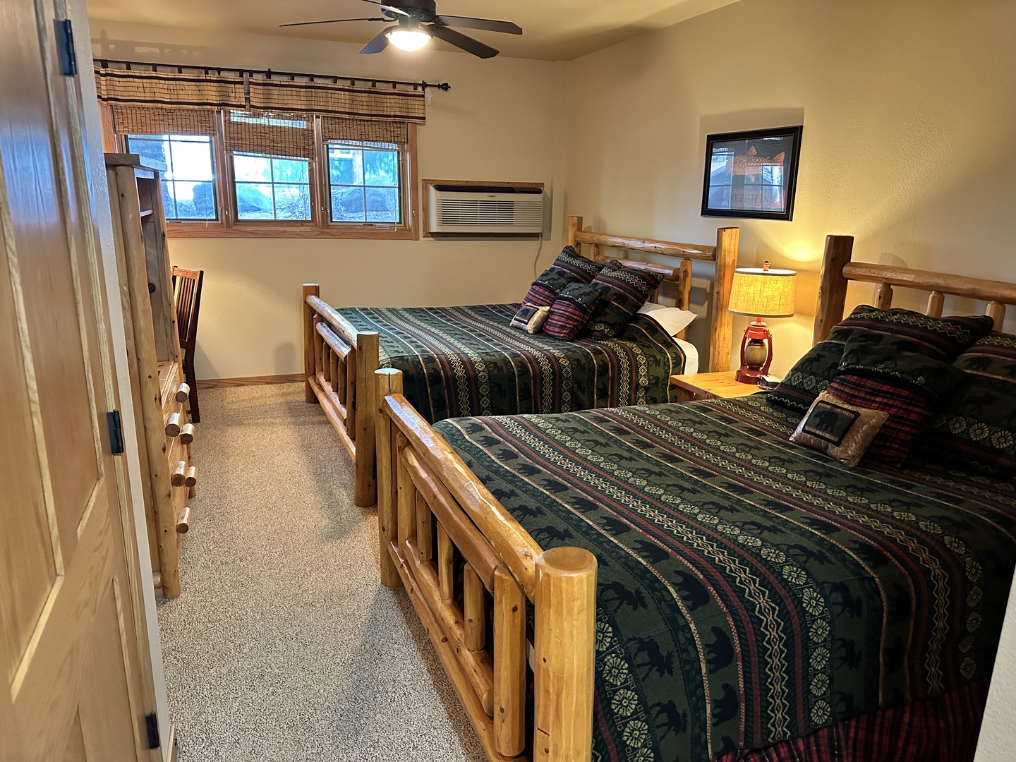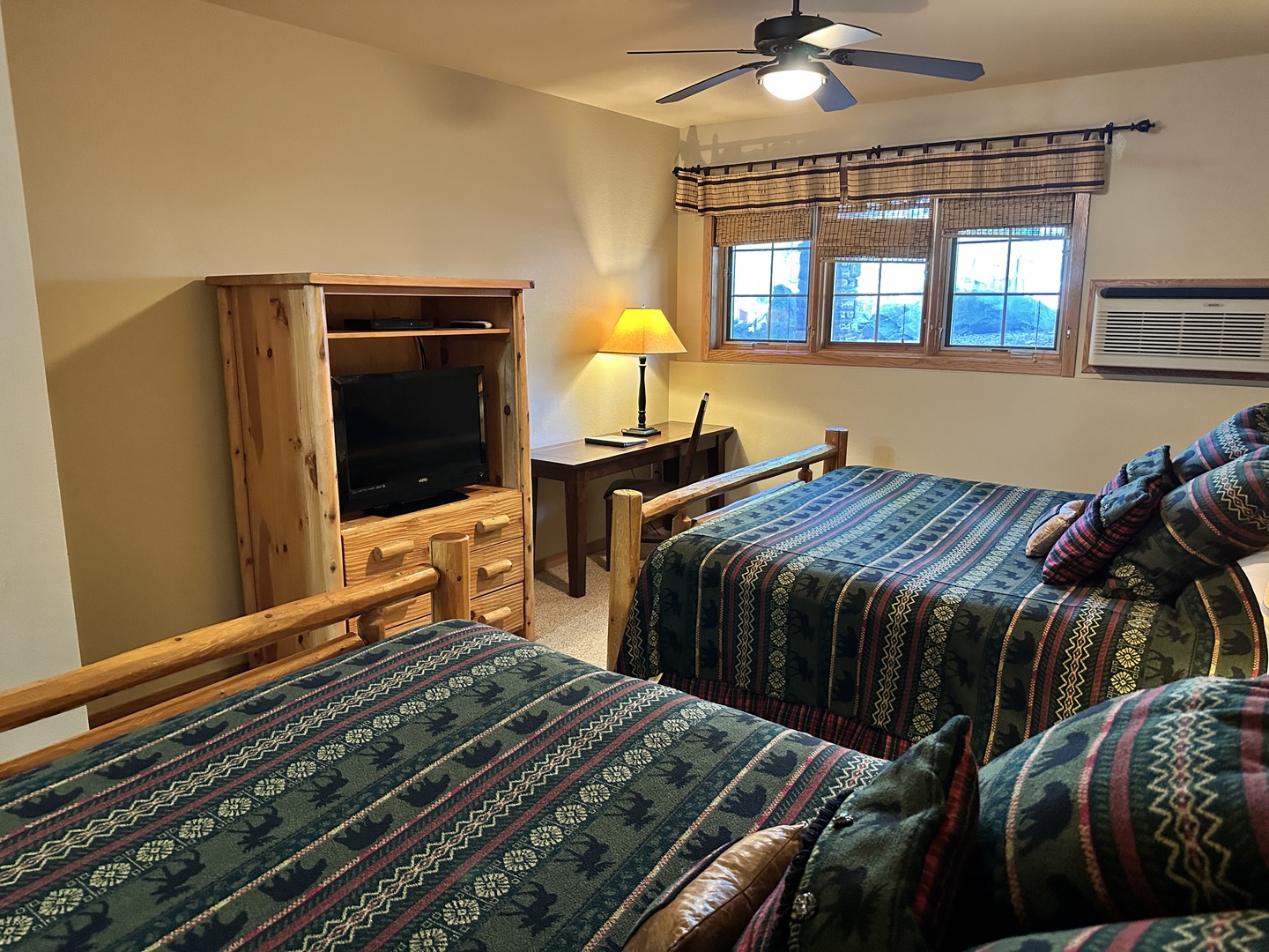 1 King and 1 Queen bed The family friendly arrangement of our Studio guestrooms makes your family vacation a breeze. Store snacks in the mini-fridge and microwave some popcorn before movie time on the satellite TV. A spacious bathroom helps everyone get ready and out the door on-time for whatever adventure has been planned for the day.