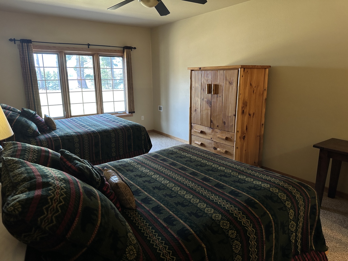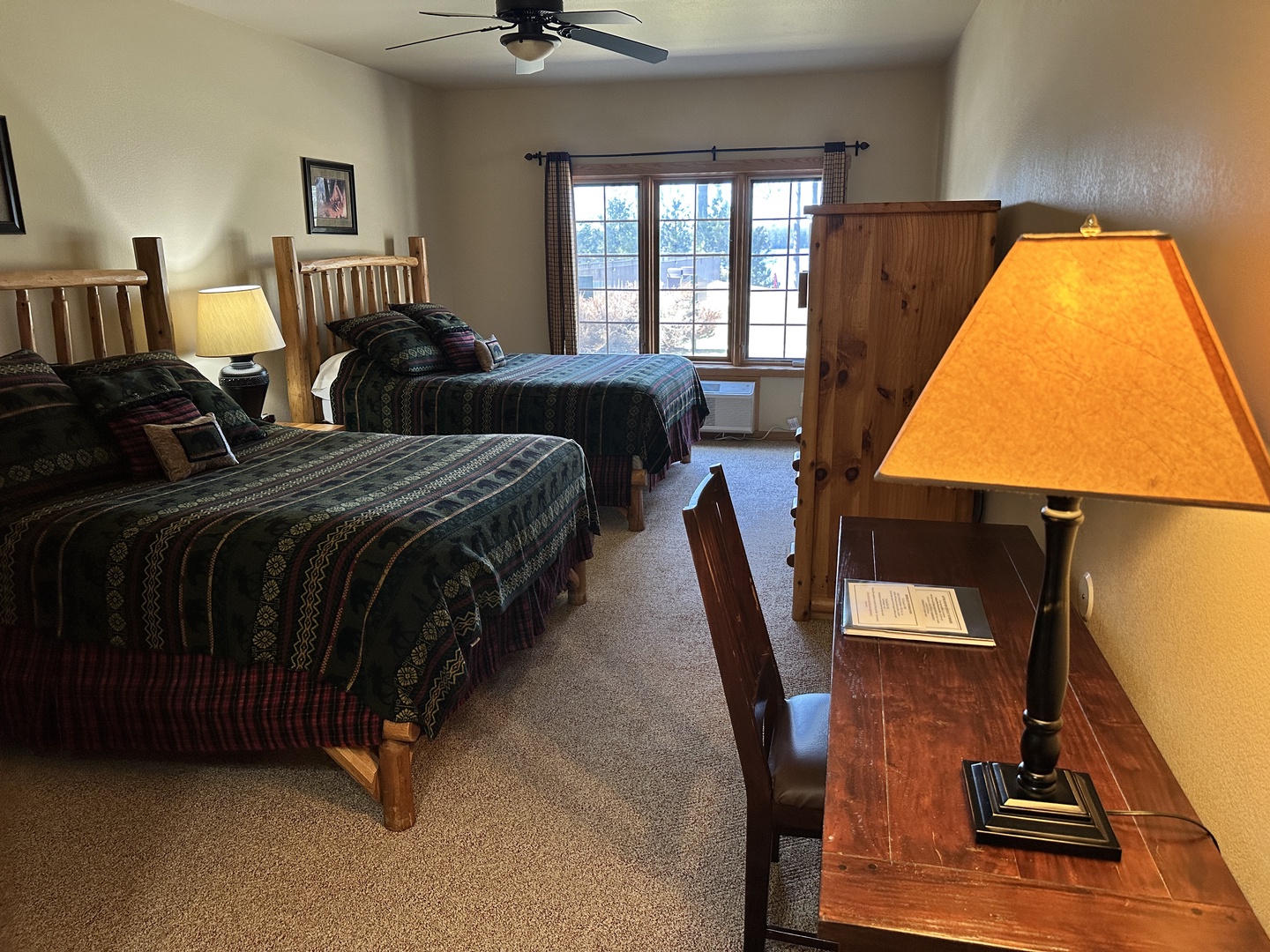 Year round lake-view hotel-style 442 square foot room with private bath that has a tub with shower. 2 Queen beds The family friendly arrangement of our Studio guestrooms makes your family vacation a breeze. Store snacks in the mini-fridge and microwave some popcorn before movie time on the satellite TV. A spacious bathroom helps everyone get ready and out the door on-time for whatever adventure has been planned for the day.