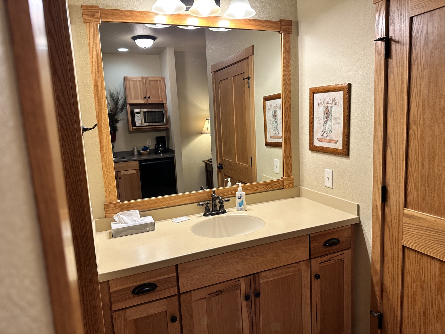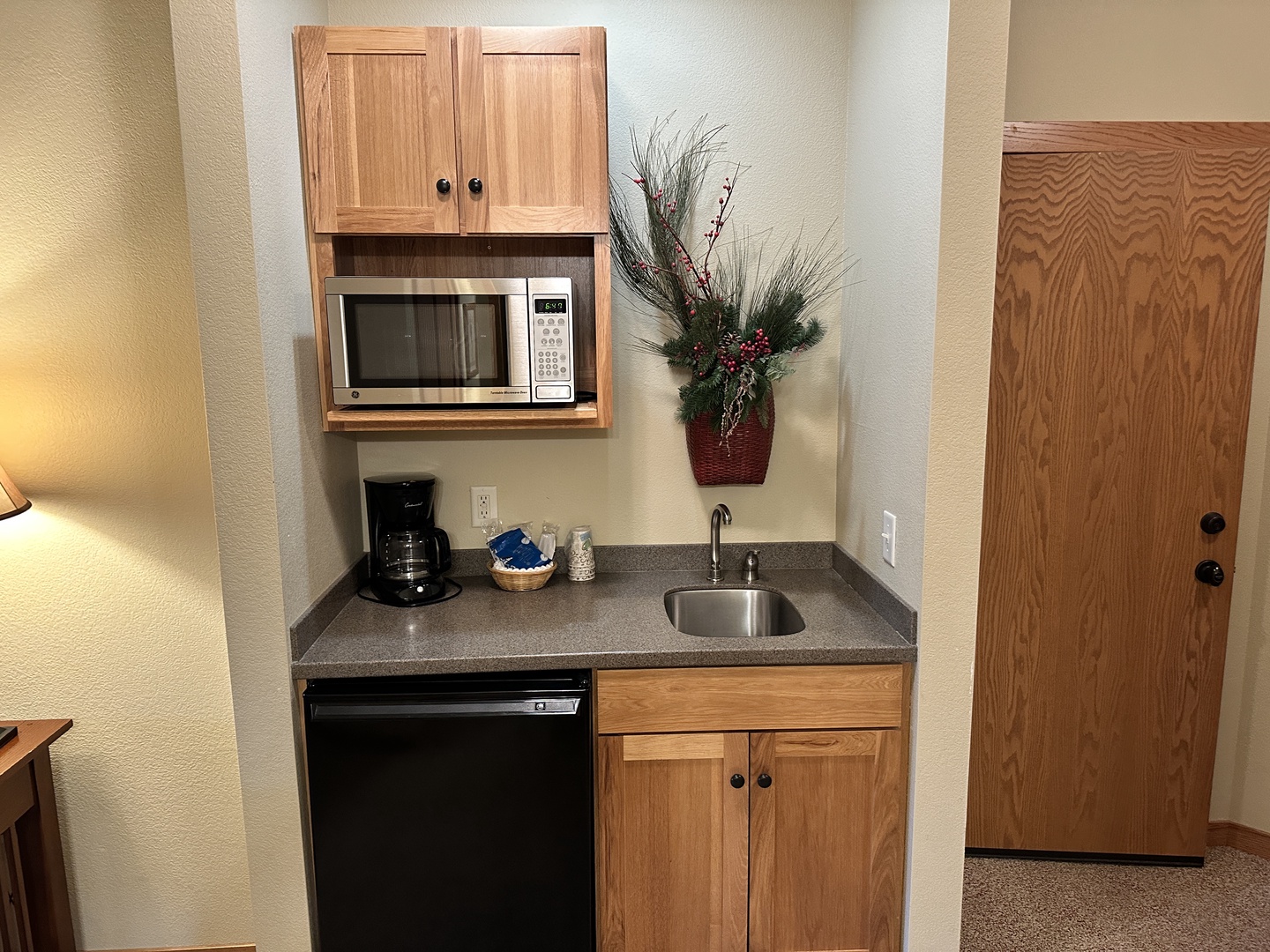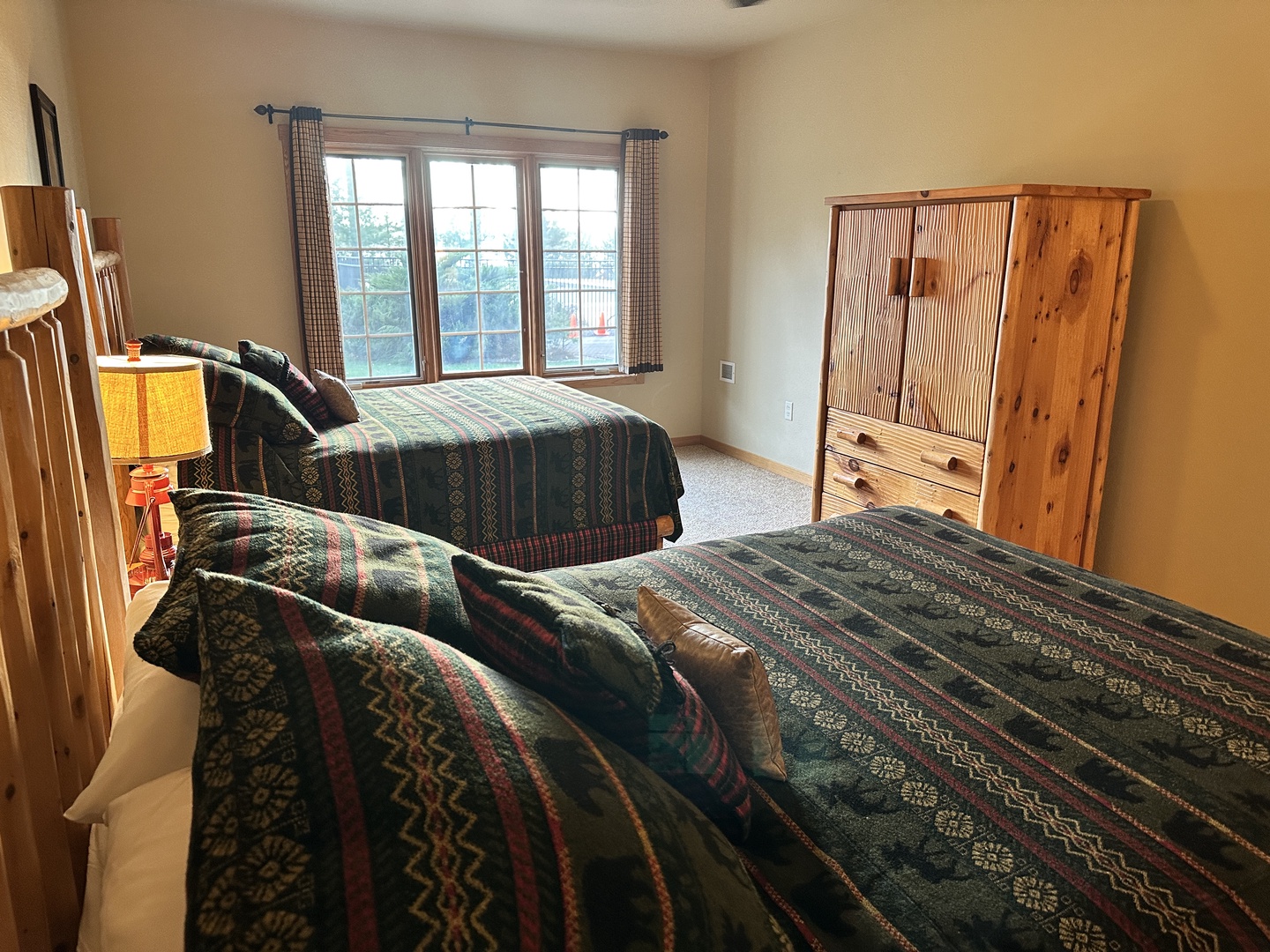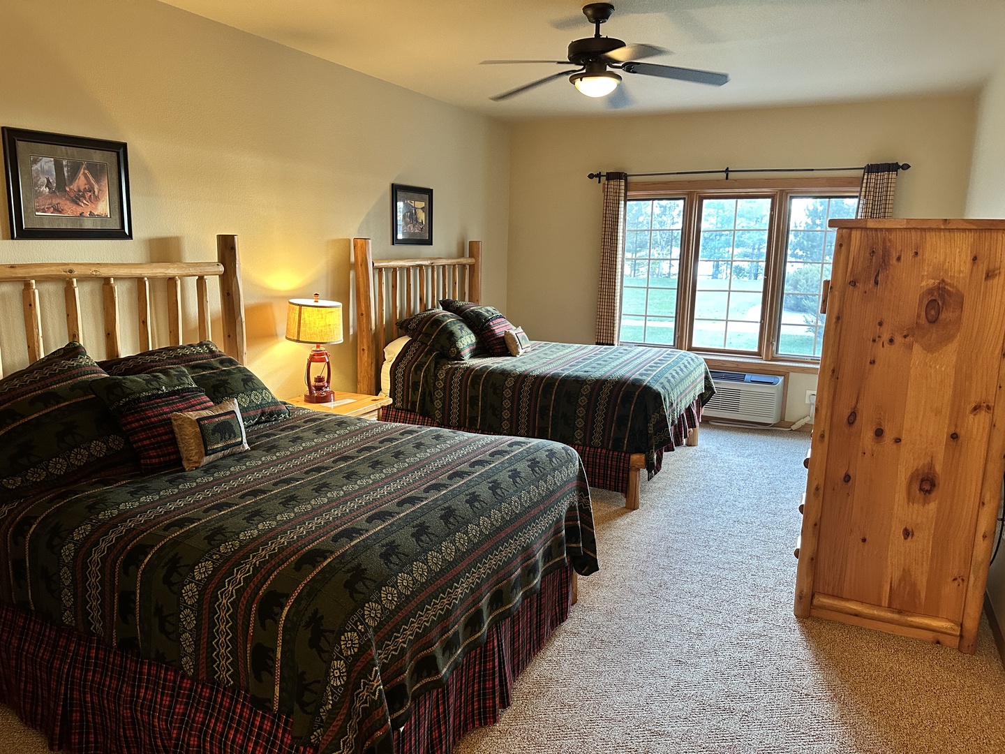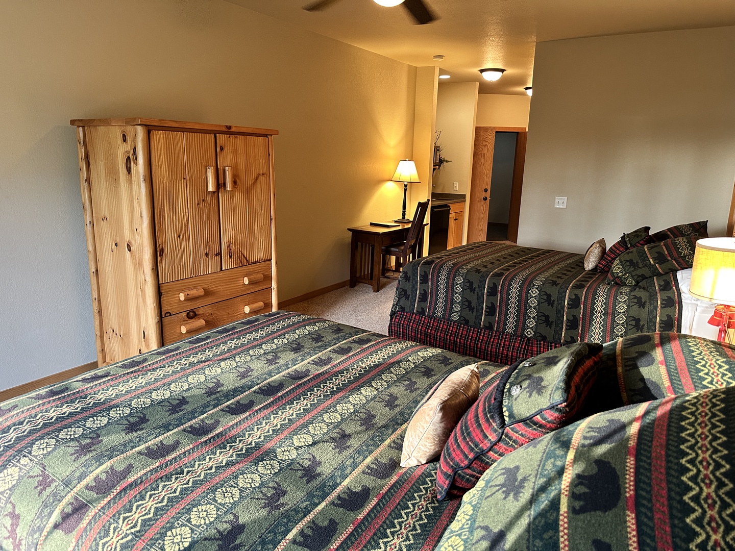 Year round lake-view hotel-style 442 square foot room with private bath that has a tub with shower. 2 Queen beds The family friendly arrangement of our Studio guestrooms makes your family vacation a breeze. Store snacks in the mini-fridge and microwave some popcorn before movie time on the satellite TV. A spacious bathroom helps everyone get ready and out the door on-time for whatever adventure has been planned for the day.