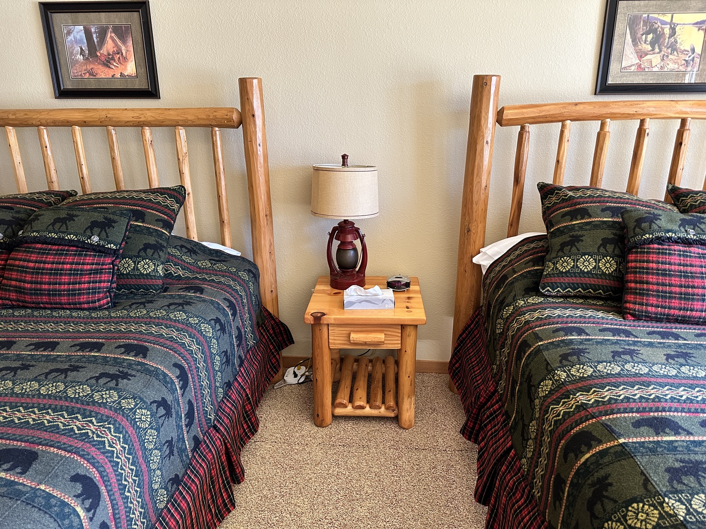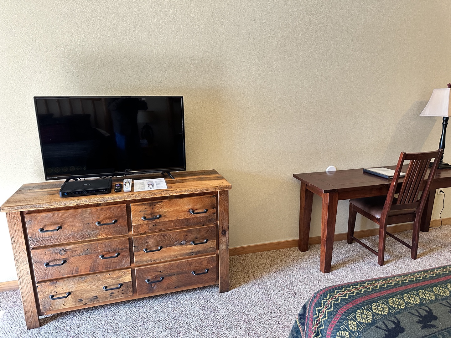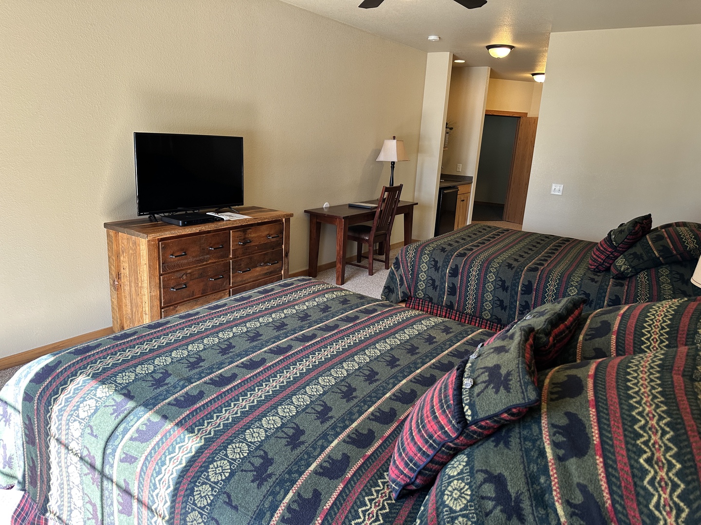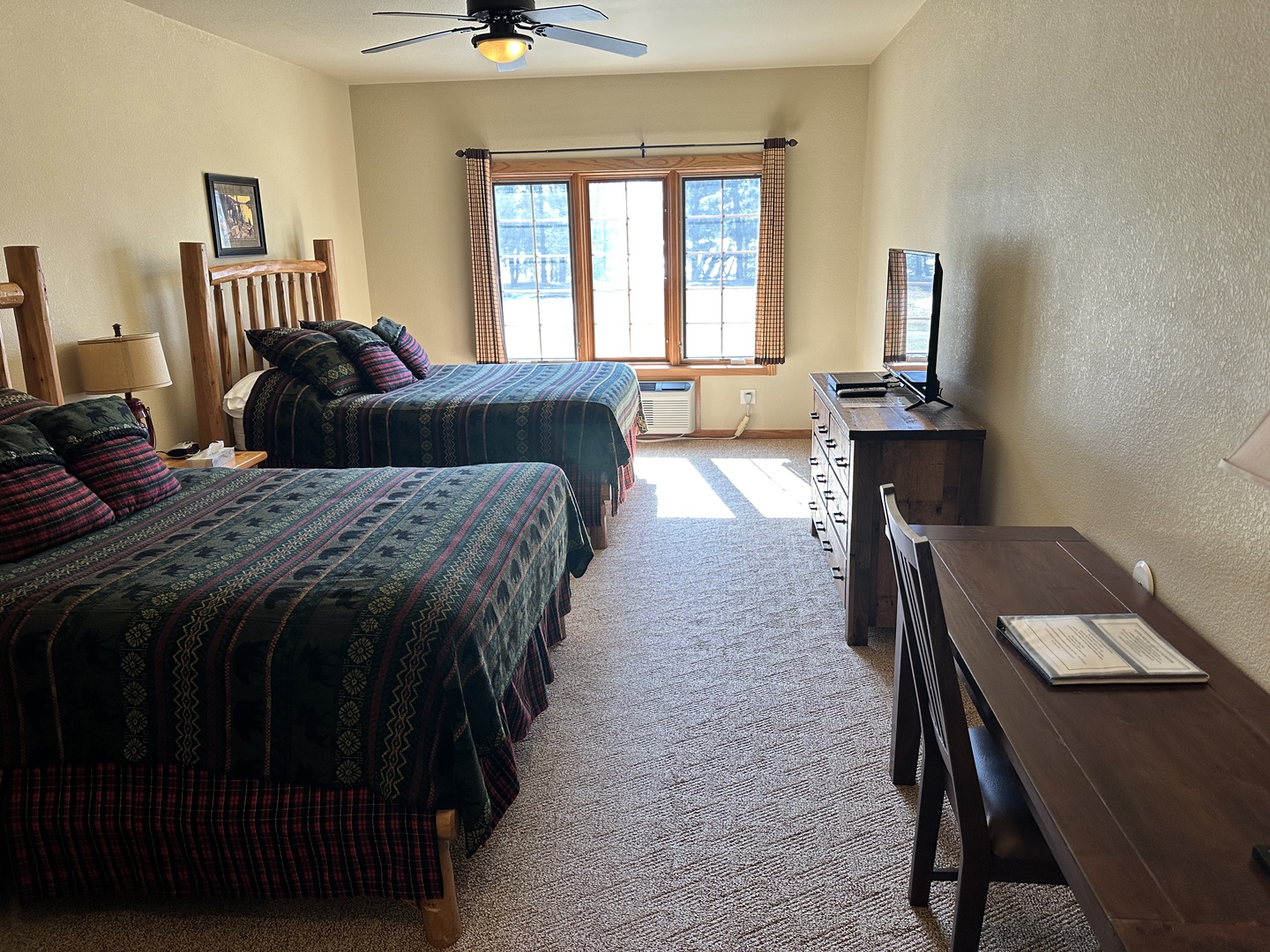Year round lake-view hotel-style 442 square foot room with private bath that has a tub with shower. 2 Queen beds The family friendly arrangement of our Studio guestrooms makes your family vacation a breeze. Store snacks in the mini-fridge and microwave some popcorn before movie time on the satellite TV. A spacious bathroom helps everyone get ready and out the door on-time for whatever adventure has been planned for the day.