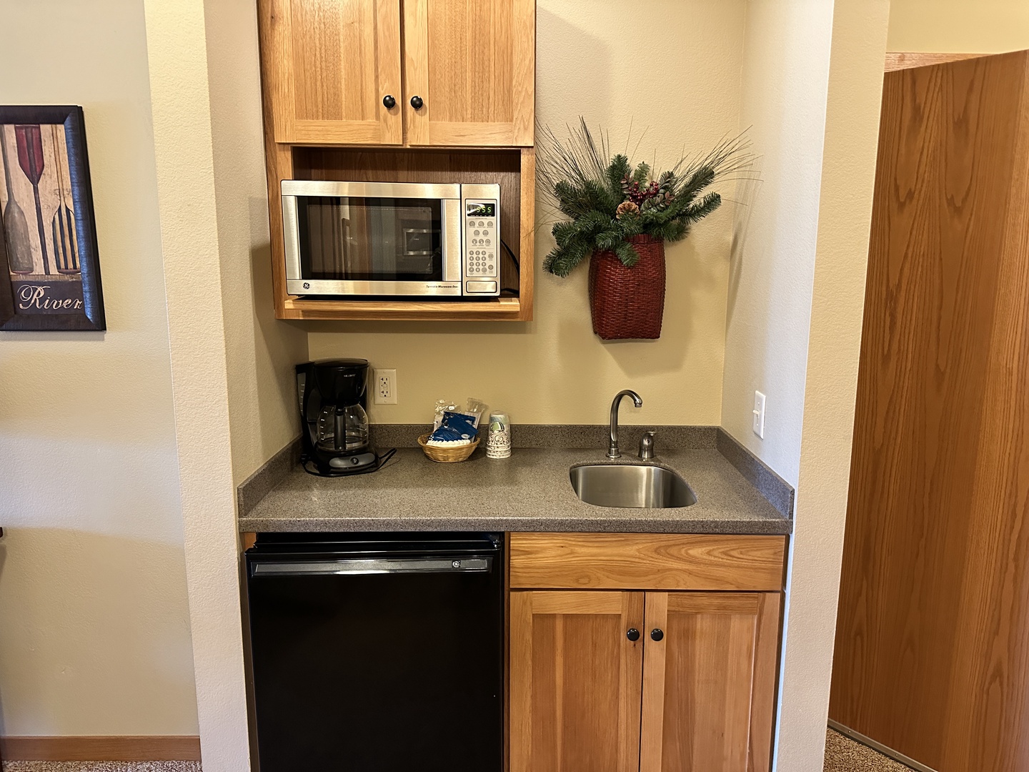Year round lake-view hotel-style 442 square foot room with private bath that has a tub with shower. 2 Queen beds The family friendly arrangement of our Studio guestrooms makes your family vacation a breeze. Store snacks in the mini-fridge and microwave some popcorn before movie time on the satellite TV. A spacious bathroom helps everyone get ready and out the door on-time for whatever adventure has been planned for the day.