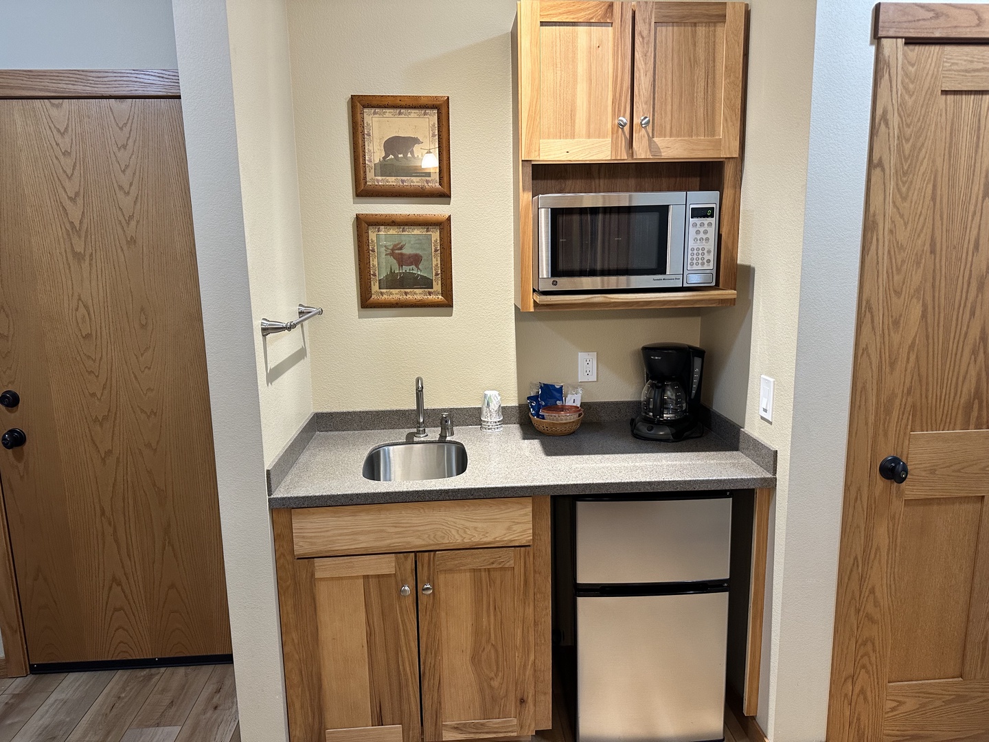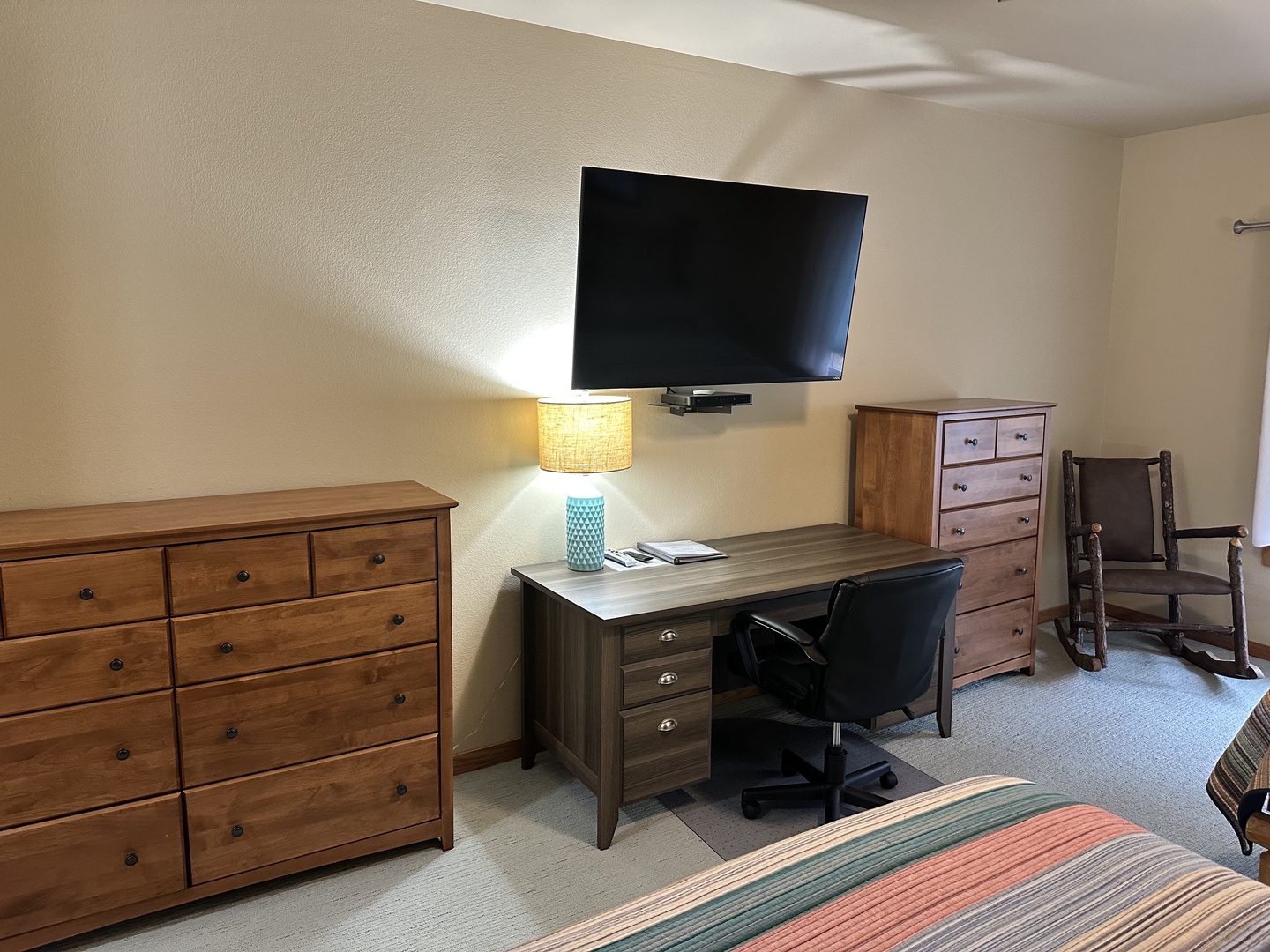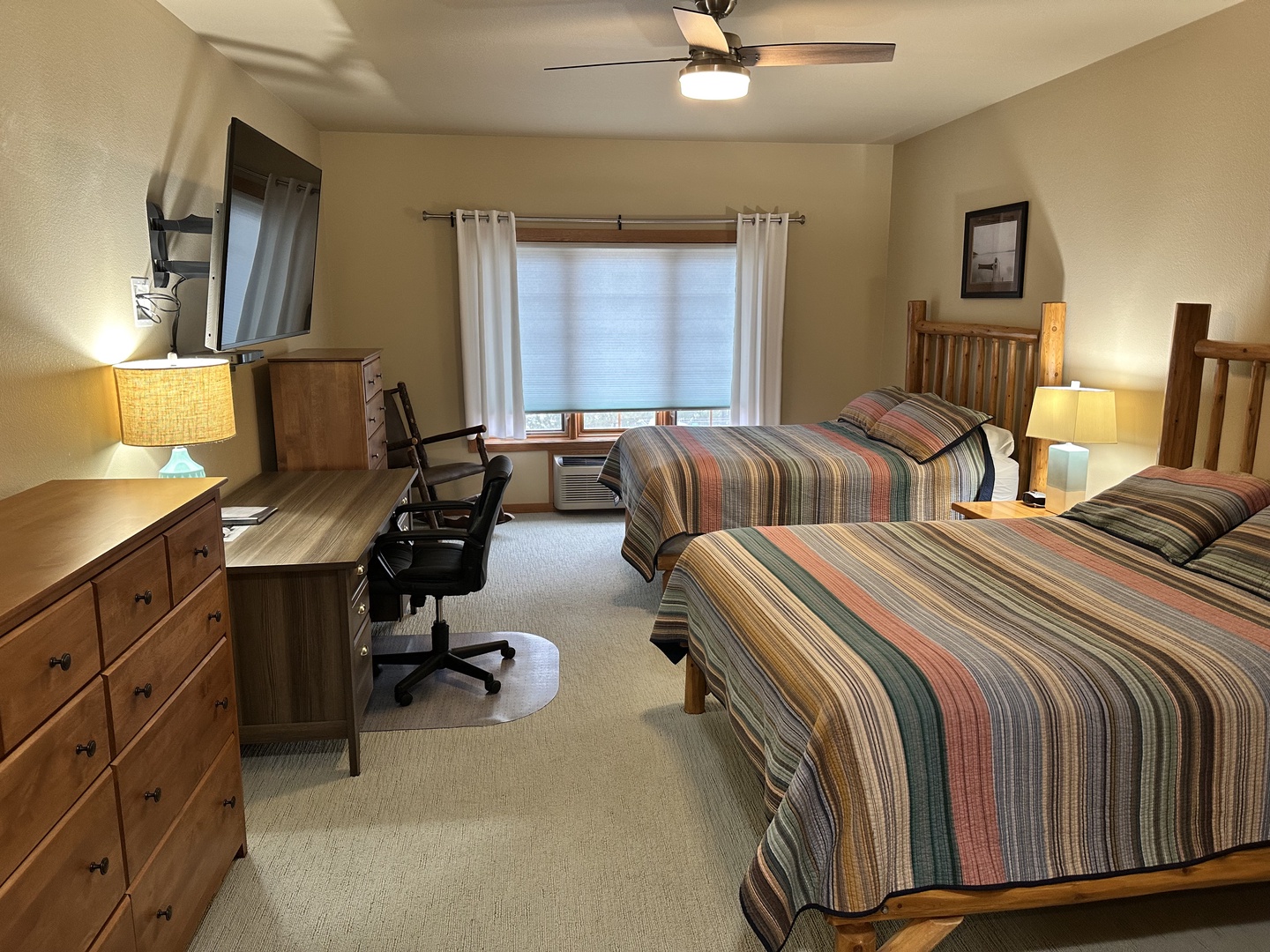 Year round lake-view hotel-style 442 square foot room with private bath that has a tub with shower. 2 Queen beds The family friendly arrangement of our Studio guestrooms makes your family vacation a breeze. Store snacks in the mini-fridge and microwave some popcorn before movie time on the satellite TV. A spacious bathroom helps everyone get ready and out the door on-time for whatever adventure has been planned for the day.