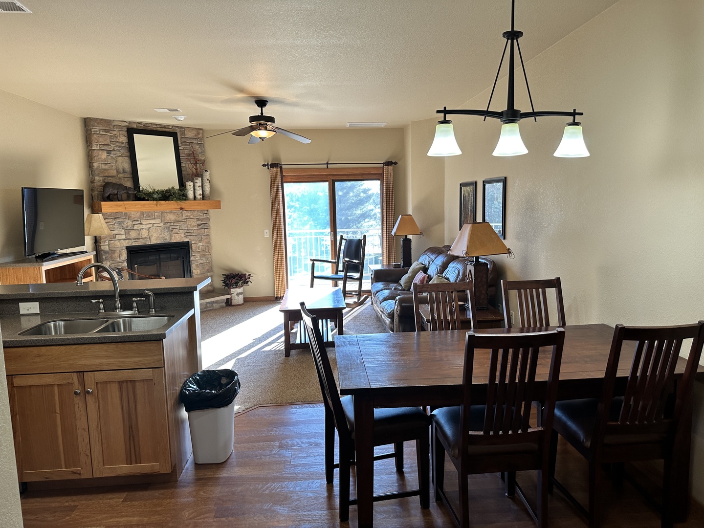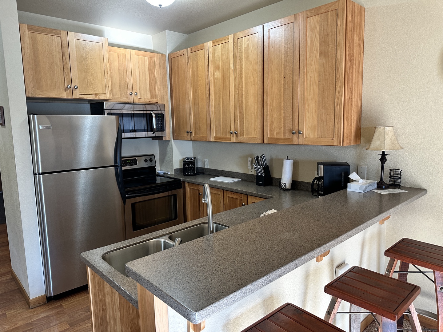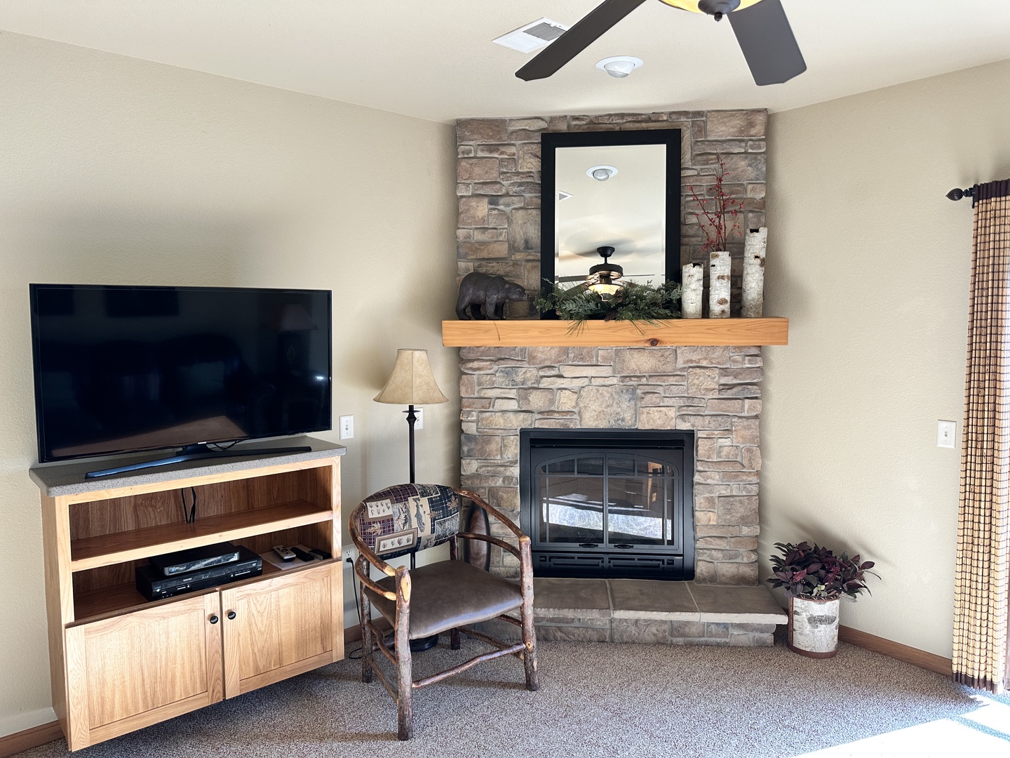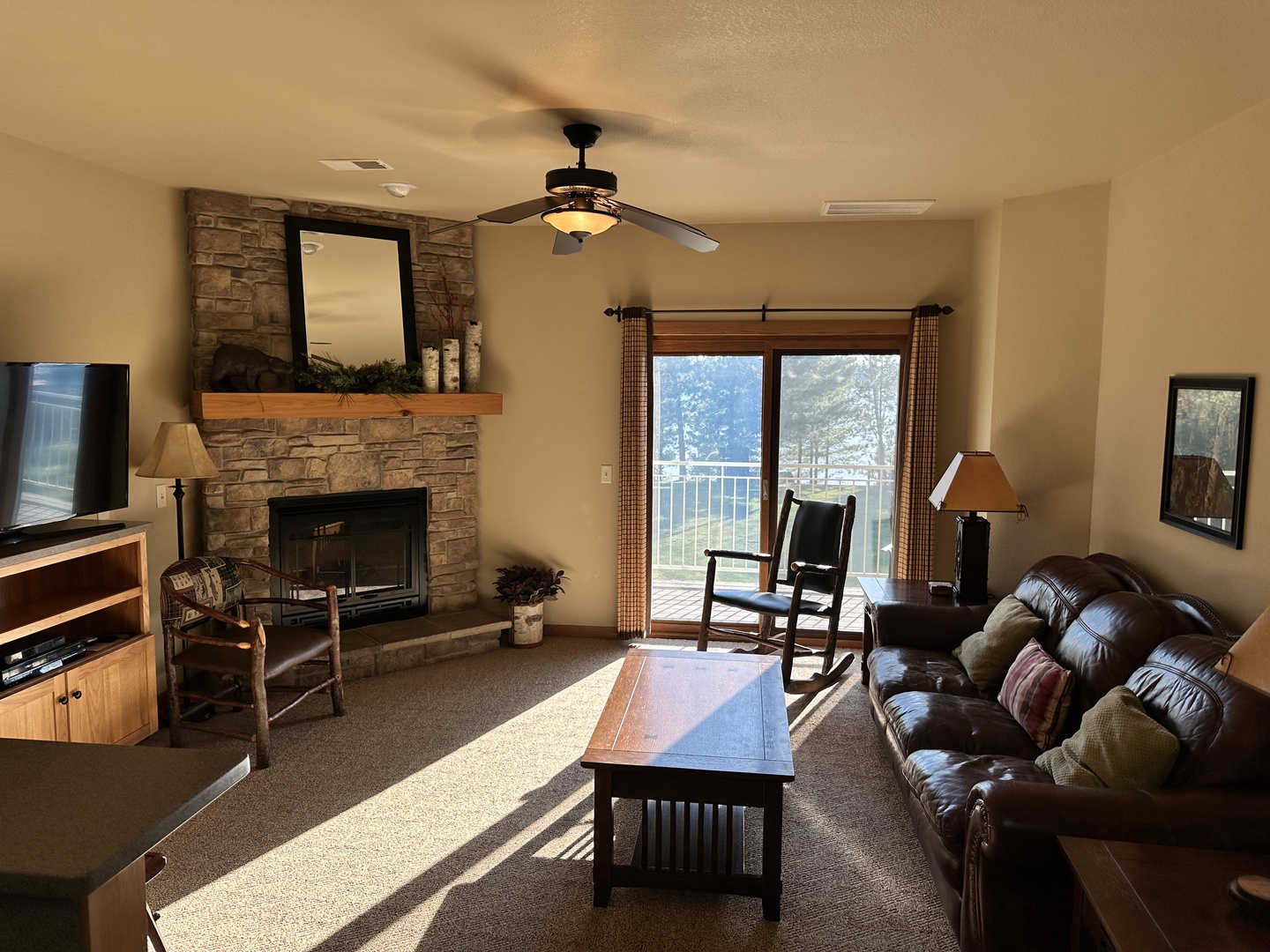 Year round lake-view 1000 square foot 1 bedroom 1 bath condominium. Each with fully equipped kitchen, living room with gas fireplace, balcony or patio that faces the lake, bathroom with a walk-in shower,1 king bed 1 queen bed