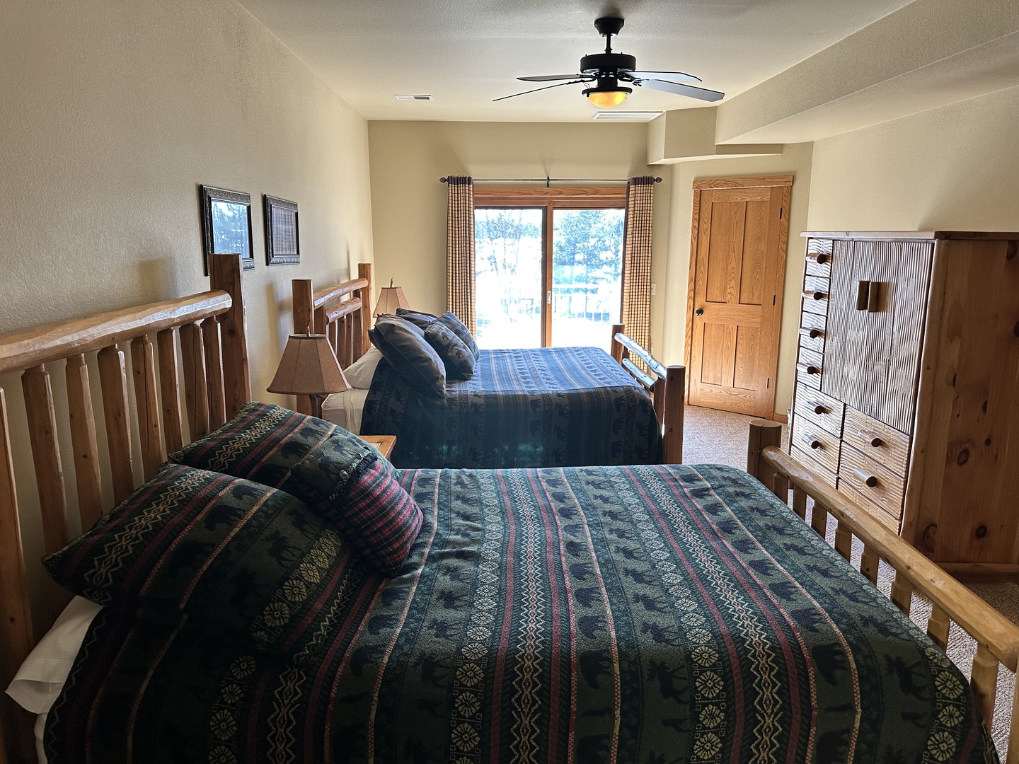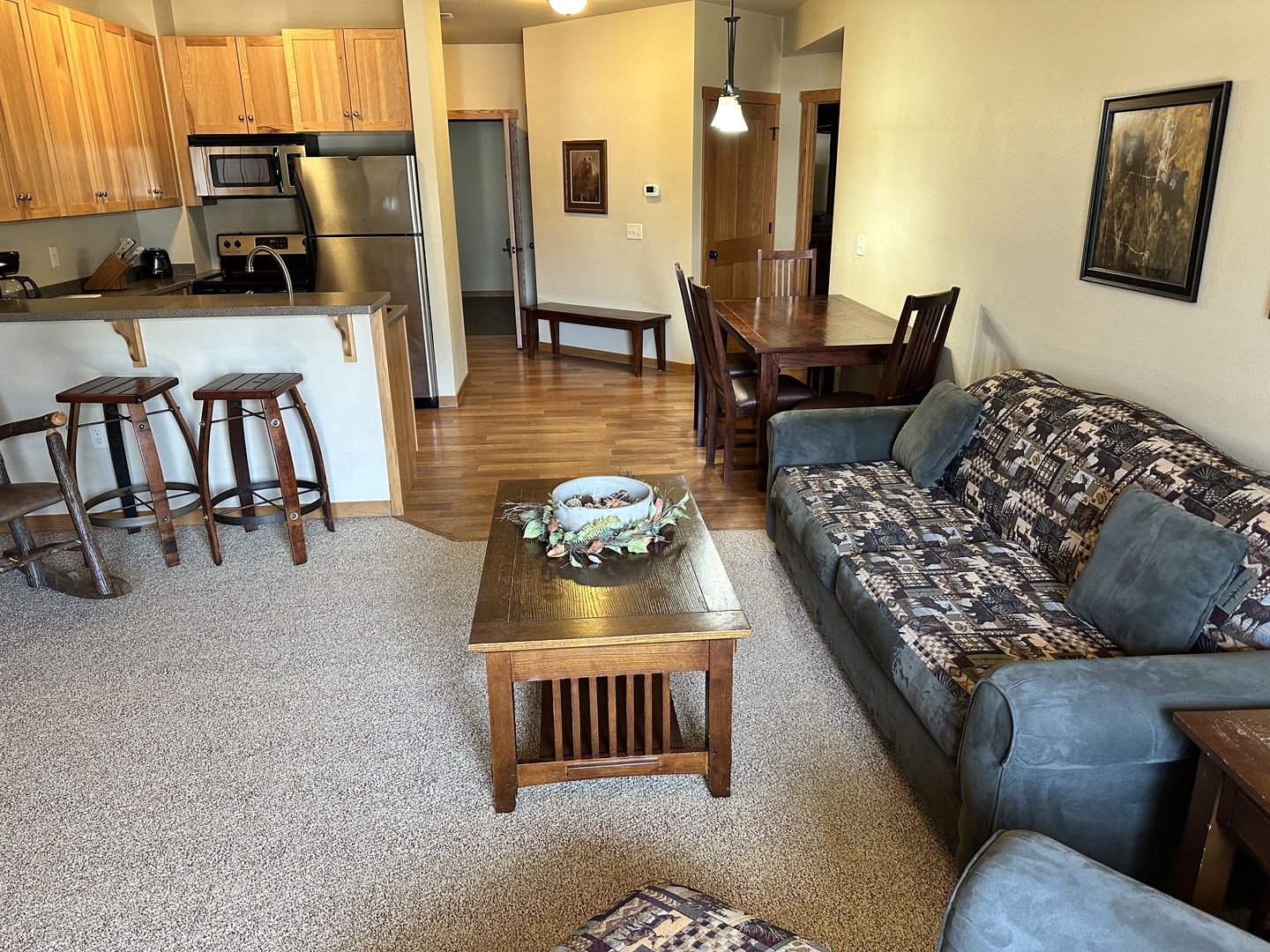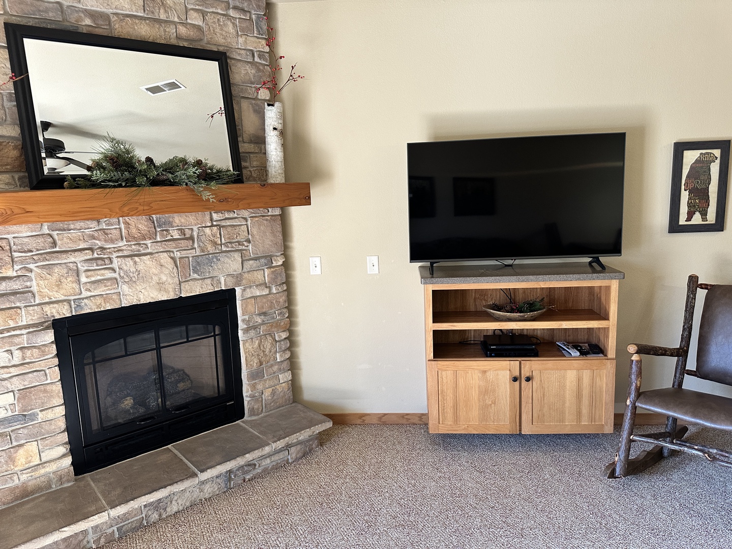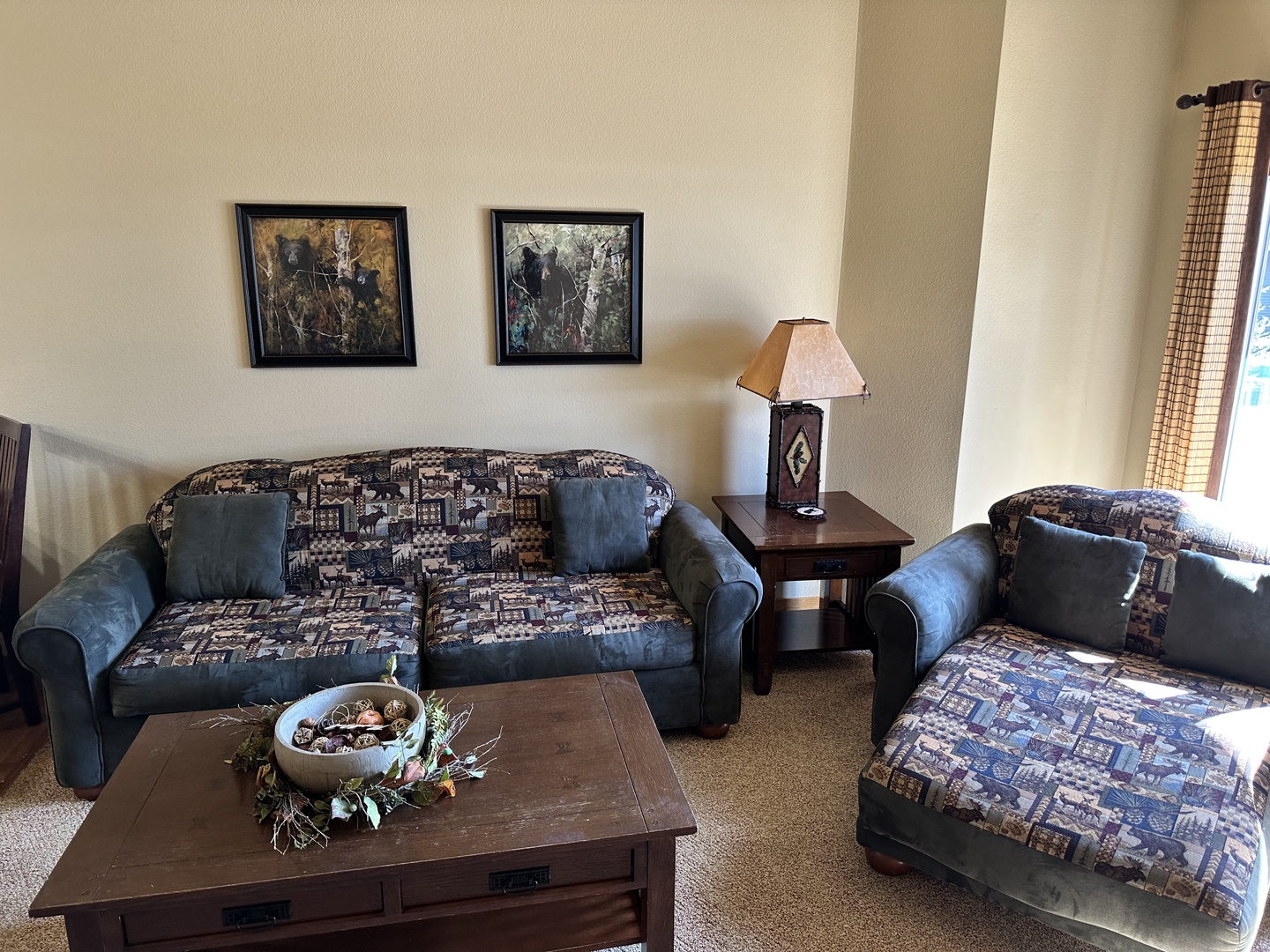 The common great room features northwoods seating and cabin decor. exterior balcony, gas fireplace, 50" Smart TV with SonicNet fiber internet service, and a full kitchen with breakfast bar.