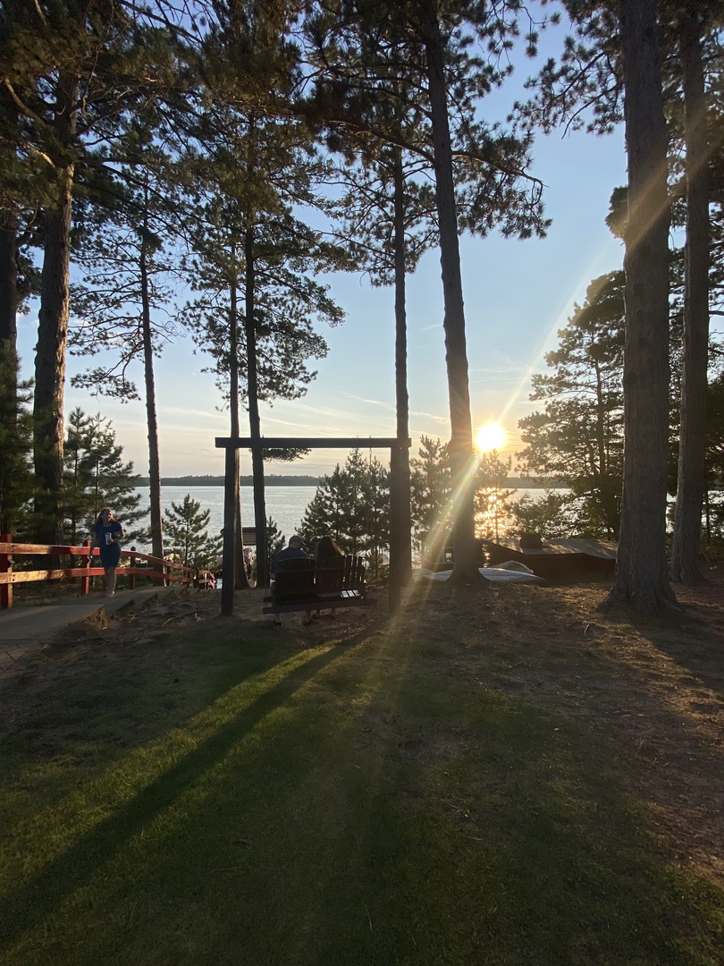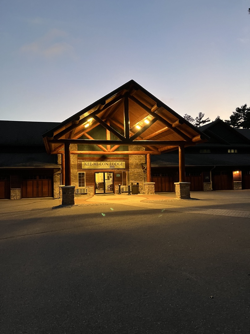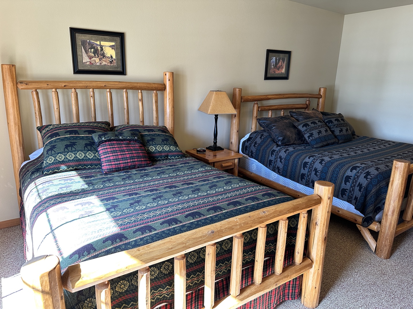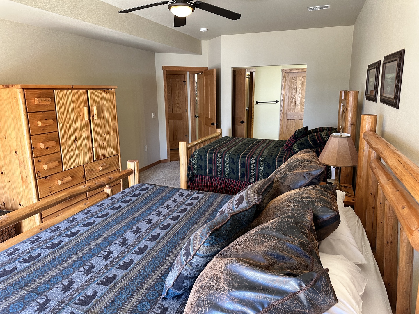 The common great room features northwoods seating and cabin decor. exterior balcony, gas fireplace, 50" Smart TV with SonicNet fiber internet service, and a full kitchen with breakfast bar.