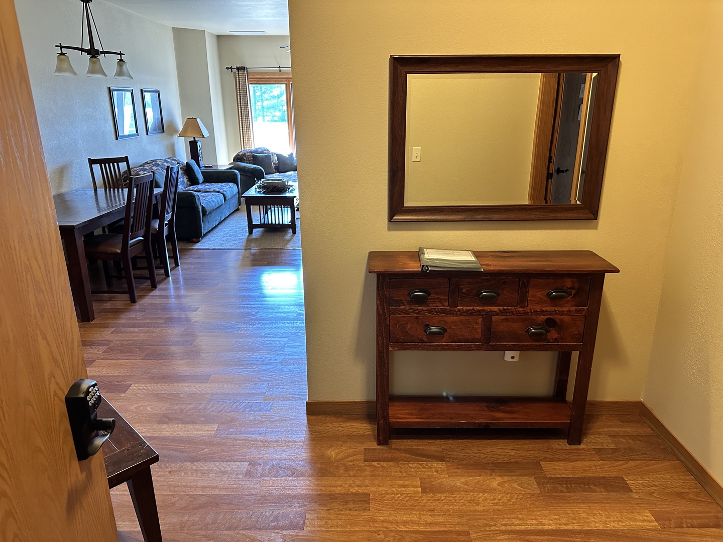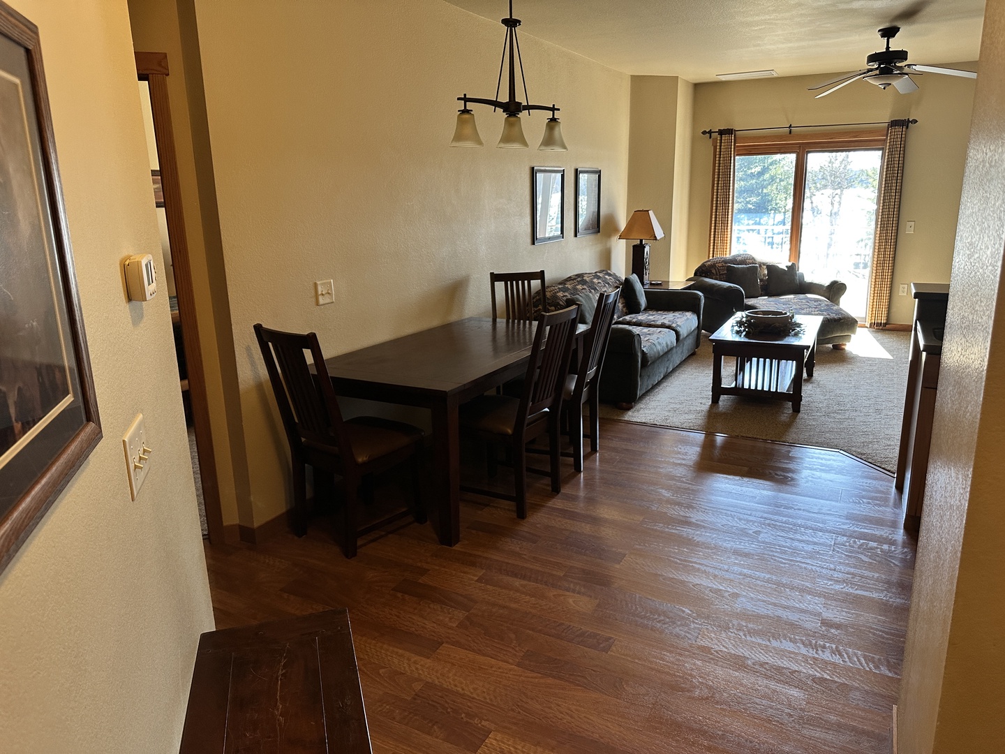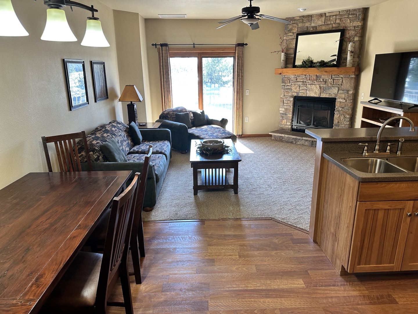 Condo 206 provides beautiful western exposure lake and pool views, with same level to garage and resort restaurant. This 1500 square foot, 2 bedroom, 2 bath unit provides ample room for friends and family, including a common great room so all can enjoy time together - and separate quiet time.